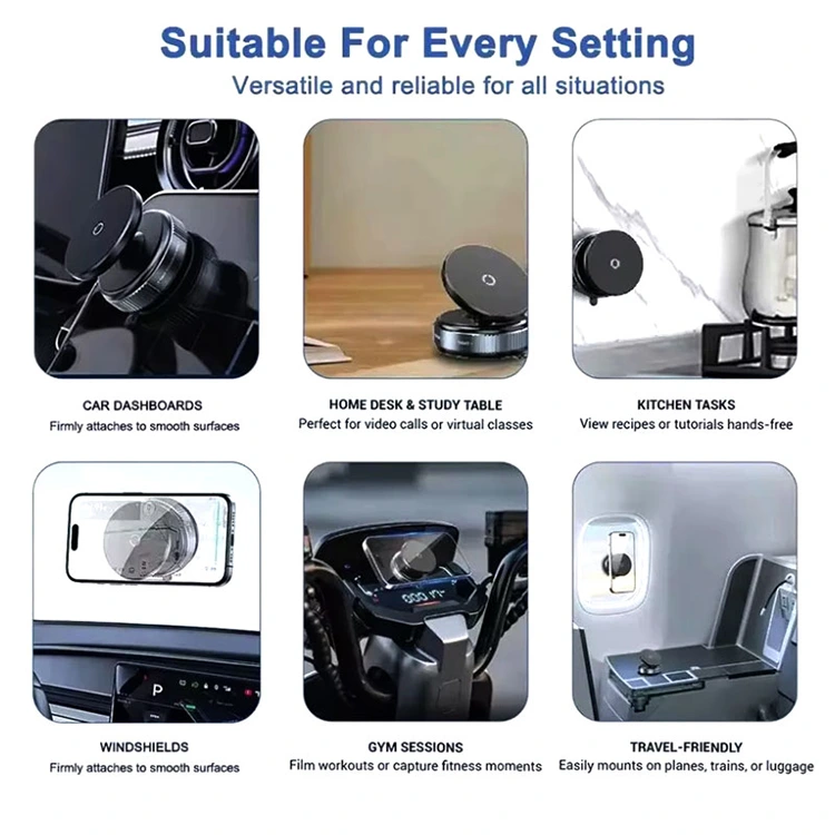 लचिलो प्रयोग: यो कार फोन माउन्ट स्थापना गर्न र सुरक्षित गर्न सजिलो छ। कुनै पनि चिल्लो सतहमा यसलाई दृढतापूर्वक लक गर्न आधारलाई बाँया तिर घुमाउनुहोस्। यसलाई हटाउन वा रिपोजिसन गर्न रिलीज गर्नको लागि आधारलाई दायाँतिर घुमाउनुहोस्। ३६०° घुम्ने बल जोइन्टले तपाईंलाई आफ्नो फोनलाई अधिकतम सुविधाको लागि कुनै पनि हेर्ने कोणमा समायोजन गर्न दिन्छ।