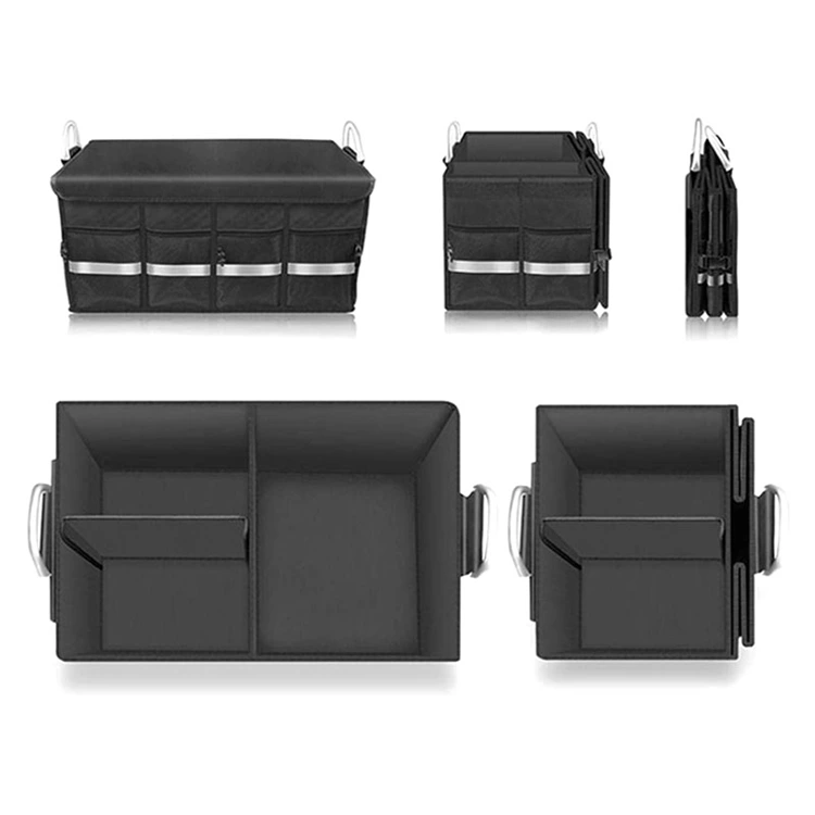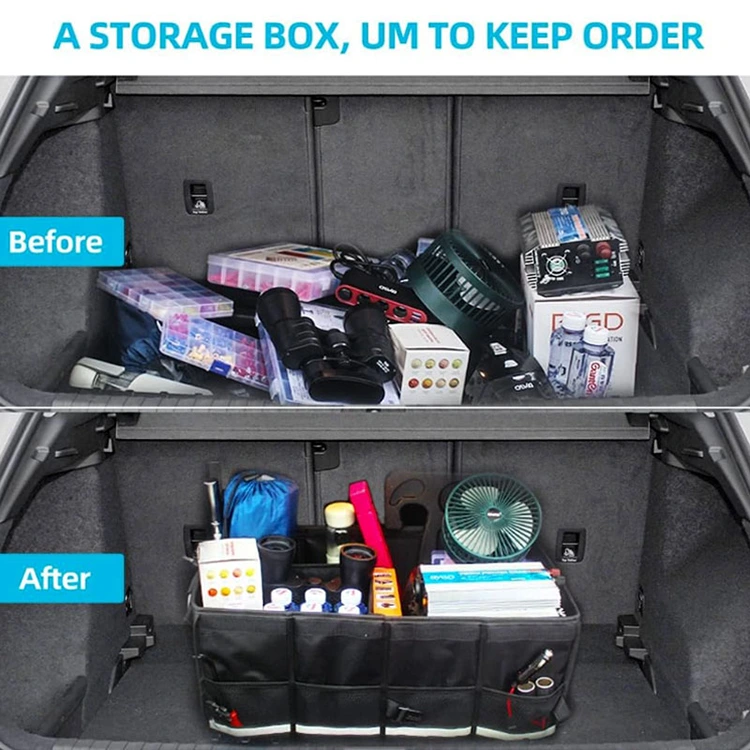 तीन मुख्य डिब्बाहरूले उपकरणहरू, खाना, खेलकुद गियर, क्लीनरहरू, र आपतकालीन वस्तुहरू व्यवस्थित गर्छन्। चार जाल साइड पकेटहरूले तौलिया वा कार्डहरू जस्ता साना सामानहरू समात्छन्। अगाडि ढक्कन भएको जेबले बाधाहरू र अन्त्यहरू सुरक्षित गर्दछ। यो ट्रक, सेडान, SUV, भ्यान, र धेरै धेरै कुनै पनि सवारीमा फिट हुन्छ।